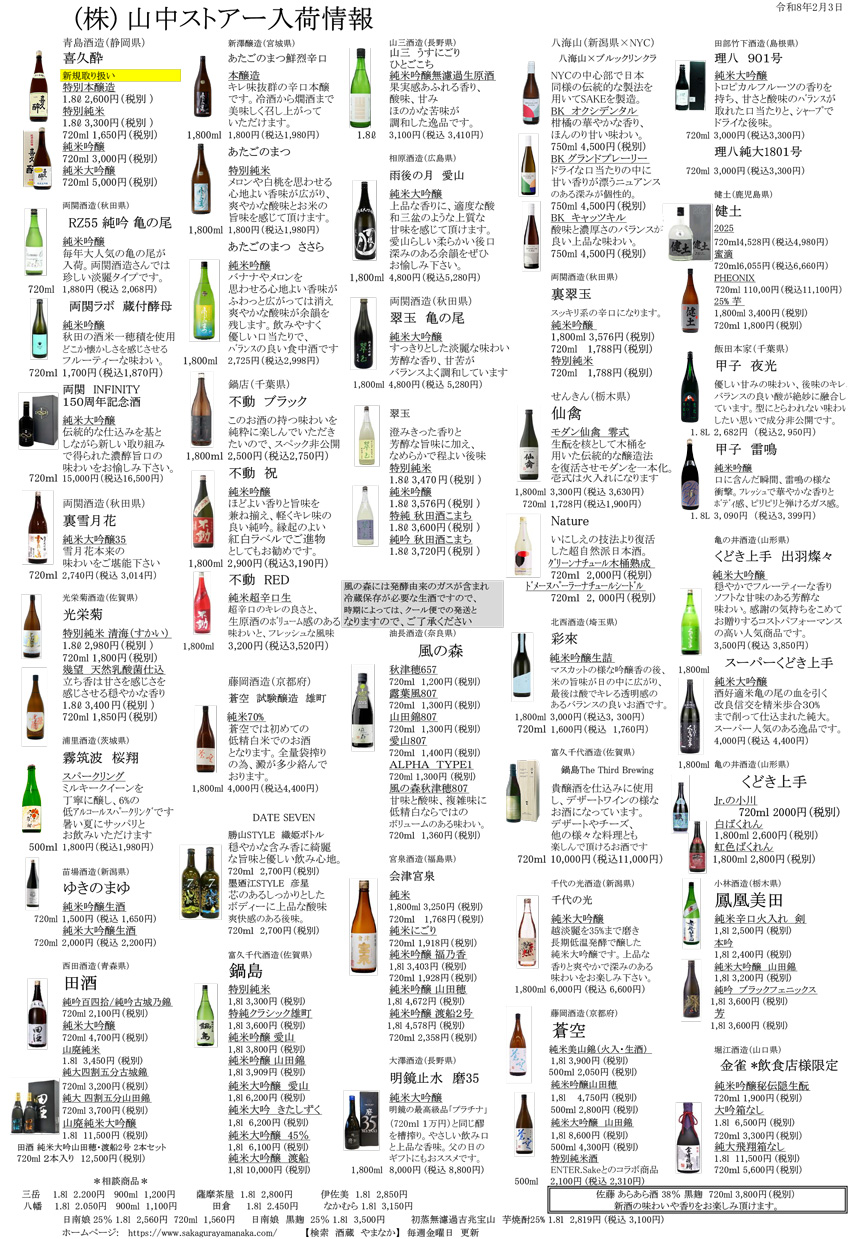 入荷情報 <<PDF>>をダウンロードして見る 在庫切れ、及び発売日前のものであっても予定数に達した場合、予告無しに受付を終了させて頂く場合がございます。予めご了承下さい。 <<PDF>>をダウンロードして見る 二十歳未満者の飲酒は法律で禁止されています。二十歳未満者への酒類の販売は固くお断り致します。 Copyright © Copyright ©sakagura yamanaka,YAMANAKA STORE Co., Ltd. TOP